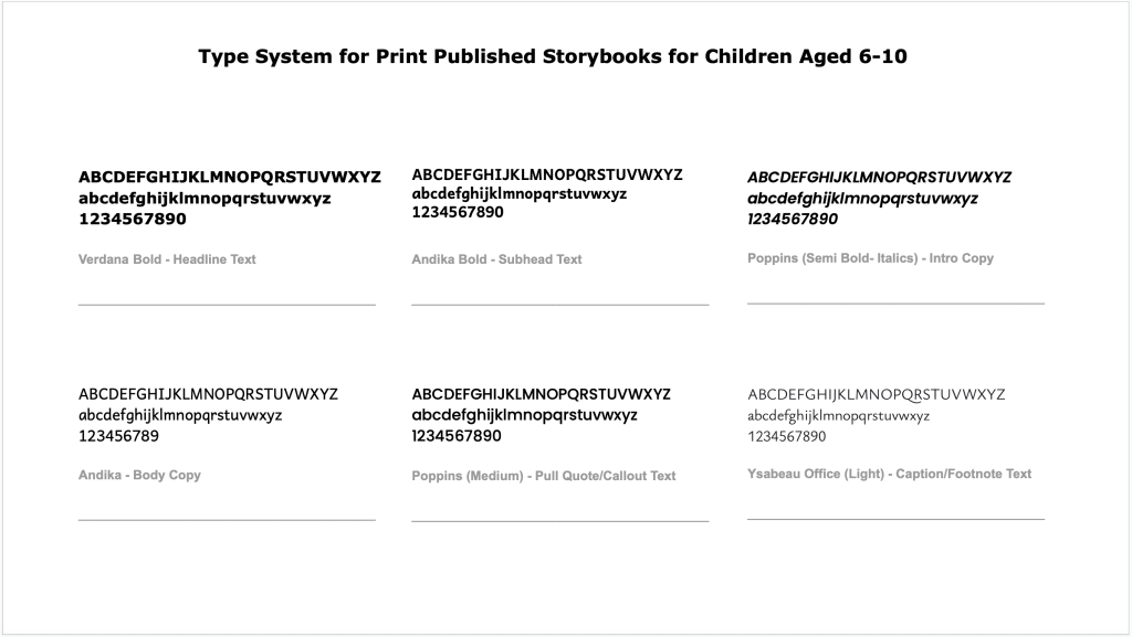 In summary, considering the functional (simplicity and readability) and emotional (fun, attractive) needs of the user, this type system combines various weights, styles and colors to create a visual hierarchy for the user which aligns with their goals of reading a storybook. The header typeface is simple to read, while the sub-head is lowkey to understate the importance of that section. The intro text introduces a fun element to draw the user into the main content. While the body typeface is focused on improving readability for the user. The pullquote style again serves as a hook for users to draw them in, if they are just browsing through the book. And finally the footnote typeface closes out the experience with an understated style to only serve those readers who have the interest to dive into the details.