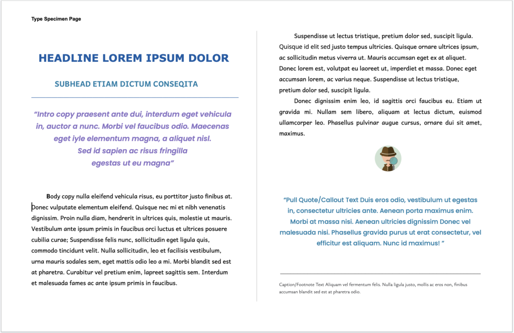Create a basic type system utilizing the principles of typography and graphic design. This should be a 6-level deep type system, with a font choice for each level: Headline, Subhead, Intro Text, Body Copy, Pull Quote/Call Out and Caption/Footnote. The design should be informed by the needs of your target user.
