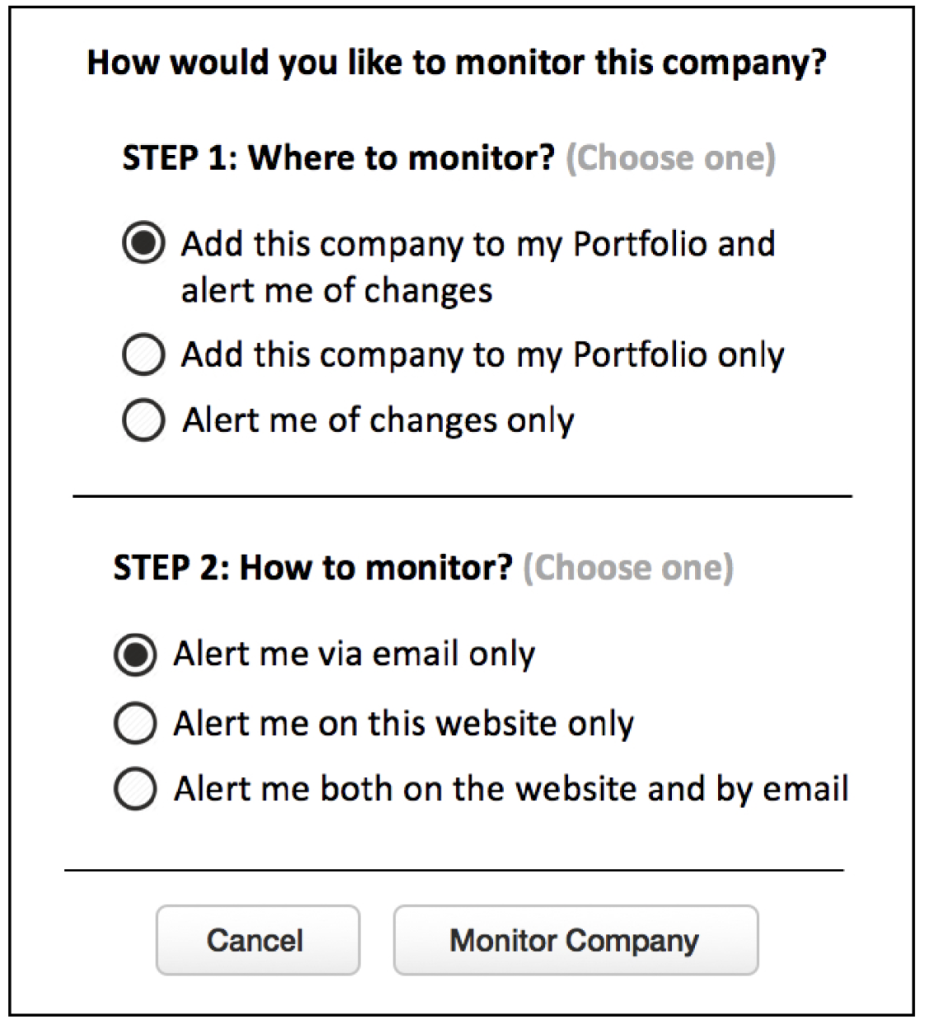 - Confusion Between Steps: The original design presented two independent tasks—adding the company to a portfolio and setting up alerts—as sequential steps. Labeling them “Step 1” and “Step 2” implied a required flow, which was not the case. Users might incorrectly assume they must complete the first task to access the second.