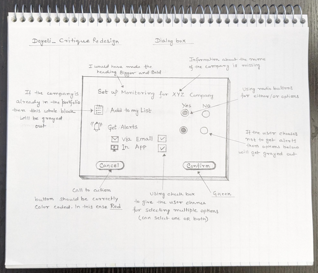 Provide a detailed critique and redesign of a dialog box in a web-based application used by accounting and credit departments for monitoring companies’ financial stability. The critique evaluates the usability of the design in context, while the redesign focuses on improving user experience by addressing identified issues.